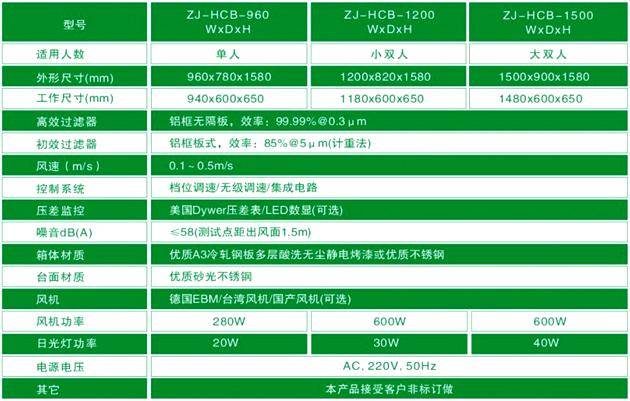 5、采用可调风量送风系统,旋钮型无级调节风速,使工作区风速处于理想状态。洁净工作台配置: 洁净工作台采用超薄型无隔板过滤器,过滤效率为:99.999%@0.3um,静态百级。将水平洁净工作台静压箱尺寸缩到小,再配以不锈钢台面和玻璃侧挡板使整顿秩序个工作室显得水平超净工作台宽敞明亮。