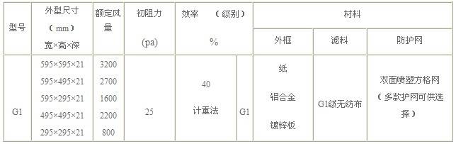 G1级初效过滤器(G1 Coarse Filter)主要适用于空调与通风系统预过滤、洁净室回风过滤、局部高效过滤装置的预过滤。