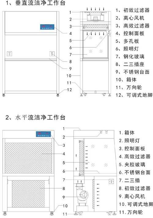 垂直流洁净工作台配置说明: 1、带刹脚轮;2、脚杯;3、支架;4、不锈钢台面;5、插座;6、玻璃;7、日光灯;8、控制开关; 9、高效过滤器;10、初效过滤器;11、风机。