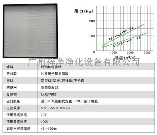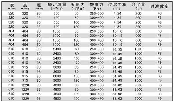 E、过滤效率:F6:65%@1.0μm、F7:85%@1.0μm、F8:90%@1.0μmH、F9:95%@0.5μm
