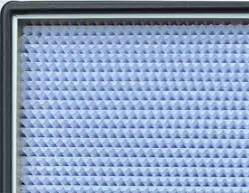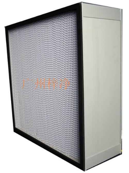 纸隔板高效过滤器使用隔板式设计,波纹型隔板可以精确地保持这层间距,有小阻力下,大限度地利用滤料,过滤器滤材两面180褶翻折形成契型褶层,滤料折弯时有两道压痕,使其在隔板的末端开成契型盒式褶层,这样可以防止滤料破损,在腐蚀的环境中,可以使用镀乙烯铝隔板,捕捉0.3UM粒子效率99.99%。